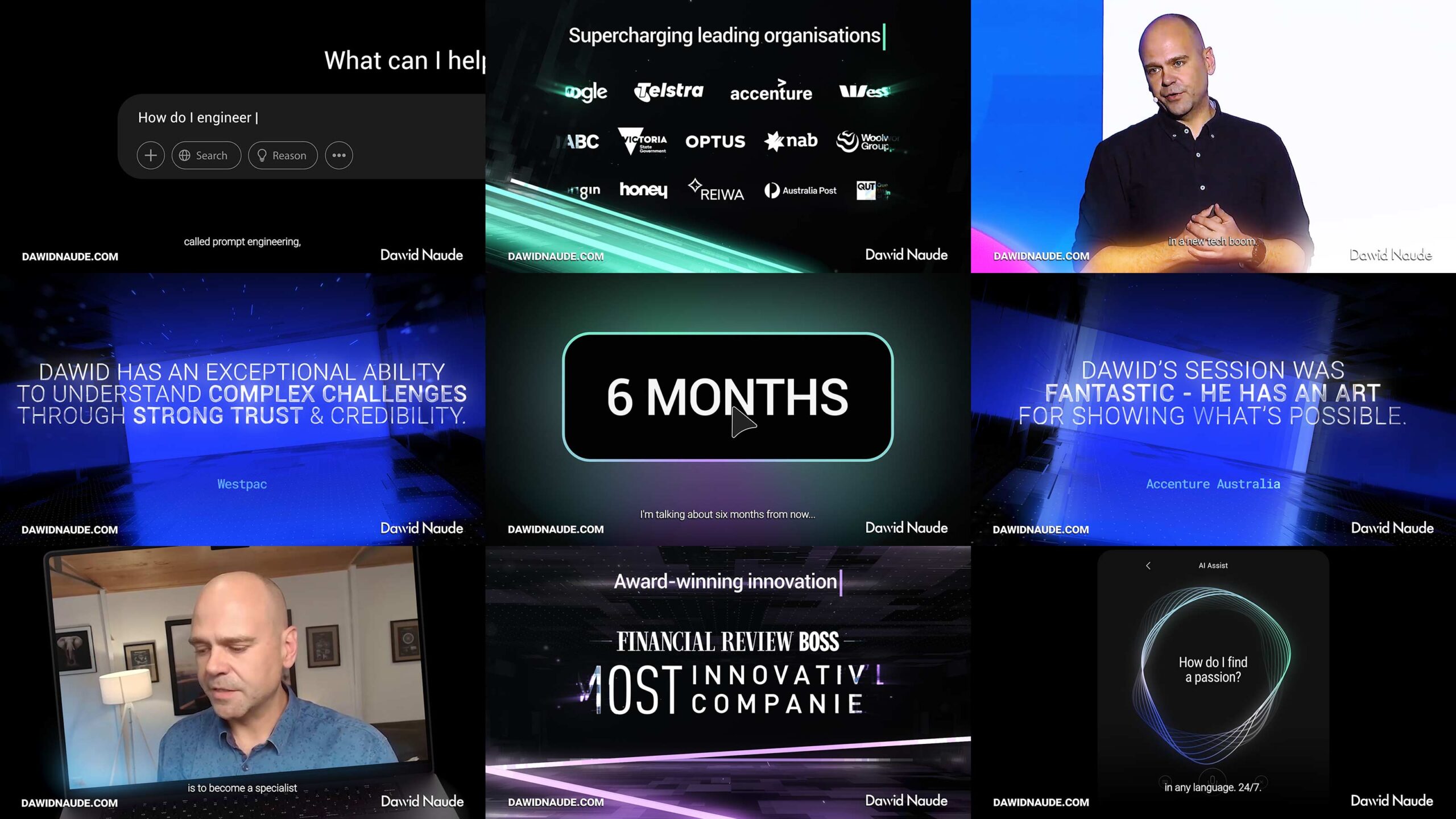 David’s work is key to the success of so many high profile thought leaders. Able to combine message, vision and that elusive ‘feel’. His cutting edge sizzle reels, presentation visuals and content always hit the mark. 100% best in the business.